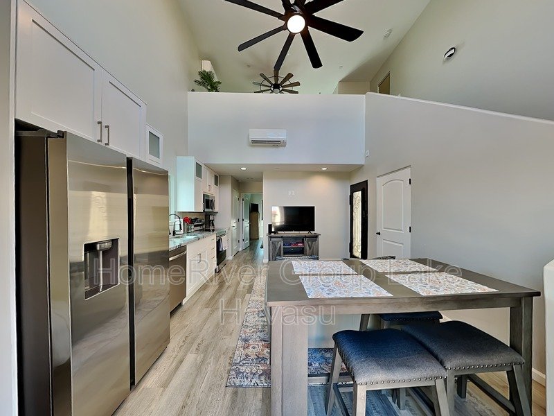 Discover the charm of this brand-new two-story condo, where comfort meets style! The garage is conveniently located on the ground floor.Step inside to find a cozy living room featuring a loveseat and a flat-panel TV, perfect for relaxation. The kitchen boasts modern stainless steel appliances and a table for two, ideal for intimate meals. You will also find a stackable washer and dryer, a bathroom, and a spacious bedroom with a king-sized bed, complemented by two nightstands and another flat-panel TV. Enjoy breathtaking lake views right from your window! An additional set of stairs leads you to the inviting loft, furnished with a sofa sleeper, two chairs, a desk, and yet another flat-panel TV. The balcony offers a delightful spot with two chairs and a table, perfect for morning coffee or evening sunsets. Enjoy high-speed internet throughout. Do not forget, this beautiful condo is a pet-free haven, making it a serene retreat for you!