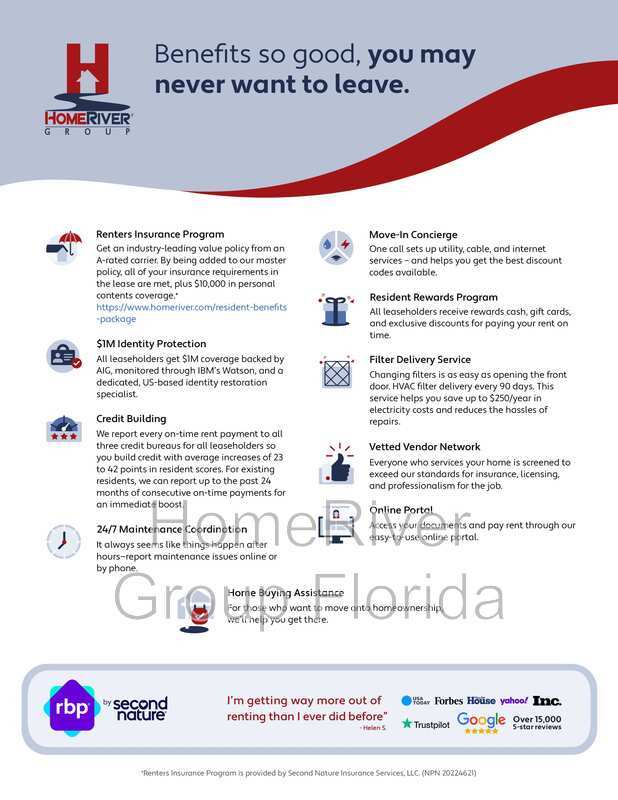 *The estimated total monthly leasing price does not include utilities or optional/conditional fees, such as: pet, utility service, and security deposit waiver fees. Our Resident Benefits Package includes required Renters Insurance, Utility Service Set-Up, Identity Theft Protection, Resident Rewards, HVAC air filter delivery (where applicable), and Credit Building, all at the additional monthly cost shown above. To learn more about additional leasing fees and requirements, please contact HomeRiver Group at 833-774-6323.