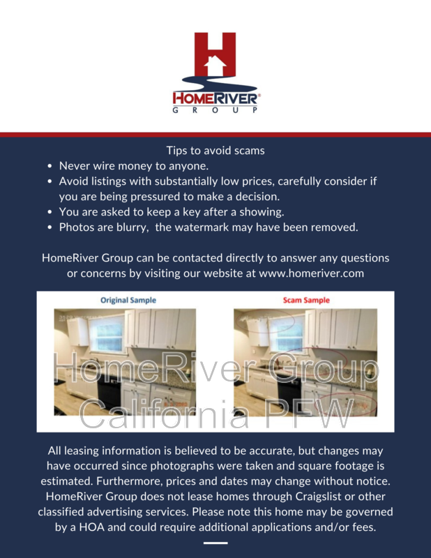 HomeRiver Group does not advertise properties on Craigslist, LetGo, or other classified ad websites. If you suspect one of our properties has been fraudulently listed on these platforms, please notify HomeRiver Group immediately. All payments related to leasing with HomeRiver Group are made exclusively through our website. We never accept wire transfers or payments via Zelle, PayPal, or Cash App. Lease your home safely through www.Homeriver.com or with the assistance of a licensed HomeRiver Group leasing agent. All leasing information contained herein is deemed accurate but not guaranteed. Please note that changes may have occurred since the photographs were taken. Square footage is estimated.