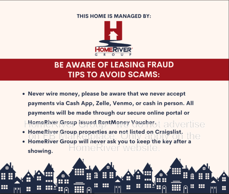 HomeRiver Group does not advertise properties on Craigslist, LetGo, or other classified ad websites. If you suspect one of our properties has been fraudulently listed on these platforms, please notify HomeRiver Group immediately. All payments related to leasing with HomeRiver Group are made exclusively through our website. We never accept wire transfers or payments via Zelle, PayPal, or Cash App. Lease your home safely through www.Homeriver.com or with the assistance of a licensed HomeRiver Group leasing agent. All leasing information contained herein is deemed accurate but not guaranteed. Please note that changes may have occurred since the photographs were taken. Square footage is estimated.