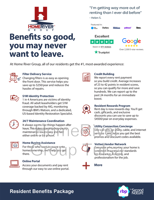 The estimated total monthly leasing price does not include utilities or optional/conditional fees, such as: pet and utility services. Our Resident Benefits Package includes required Renters Insurance, Utility Service Set-Up, Identity Theft Protection, Resident Rewards, HVAC air filter delivery (where applicable), and Credit Building, all at the additional monthly cost shown above. To learn more about additional leasing fees and requirements, please contact HomeRiver Group at 833-634-0755.