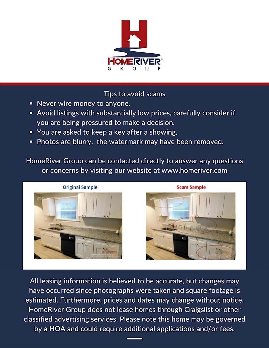 RED FLAGS - HomeRiver Group does not advertise properties on Craigslist, Facebook Marketplace, LetGo or other classified advertising websites. We will never ask for funds through CashApp, Zelle, cash, Venmo, Apple Pay, Paypal or other peer to peer networks. If you believe one of our properties has been listed on these sites by a scammer, please notify the office. Verify office number by Google.