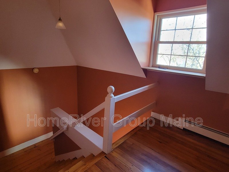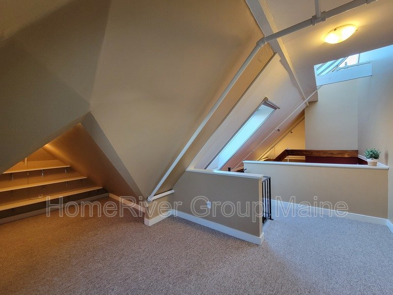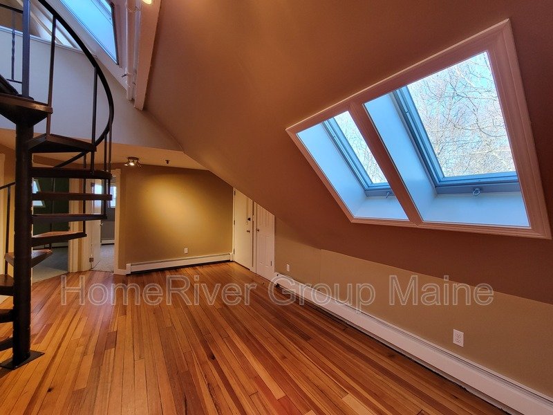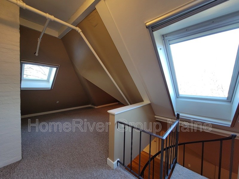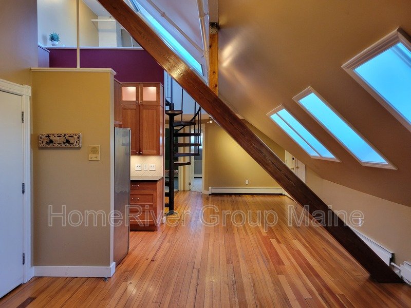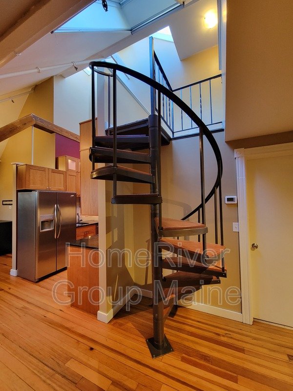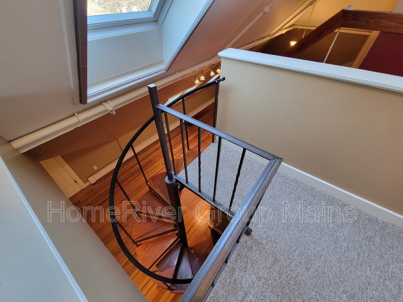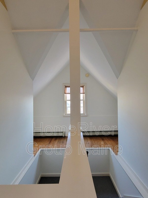 This unit is located on the third floor and consists of two bedrooms with 900 square feet of living space. The rent includes heat, making it a great deal. The space has a unique open concept design with exposed beams and a spiral staircase. Additionally, there is a bonus loft area. Skylights allow for plenty of natural light, and the high ceilings contribute to a spacious atmosphere. Another rare feature is the inclusion of two off-street parking spaces, One is at the end of the driveway out back. The other is in front of the side entrance.. In the basement, there is a shared washer and dryer, which are free to use and not coin-operated.